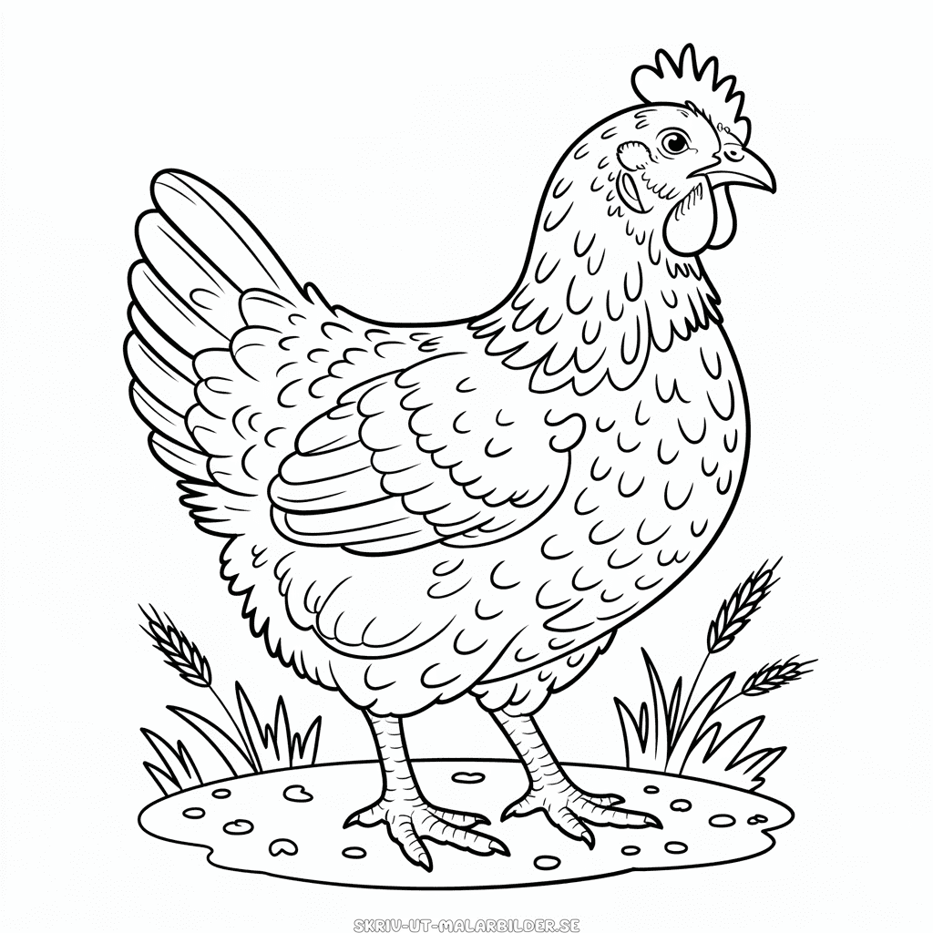 Gratis målarbild med en detaljerad höna, en vacker illustration som fångar varje fjäder i fin detalj. Skriv ut och färglägg denna teckning med en noggrant avbildad höna för barn. Högkvalitativ PNG-bild i svartvitt, optimerad för utskrift som A4-PDF.