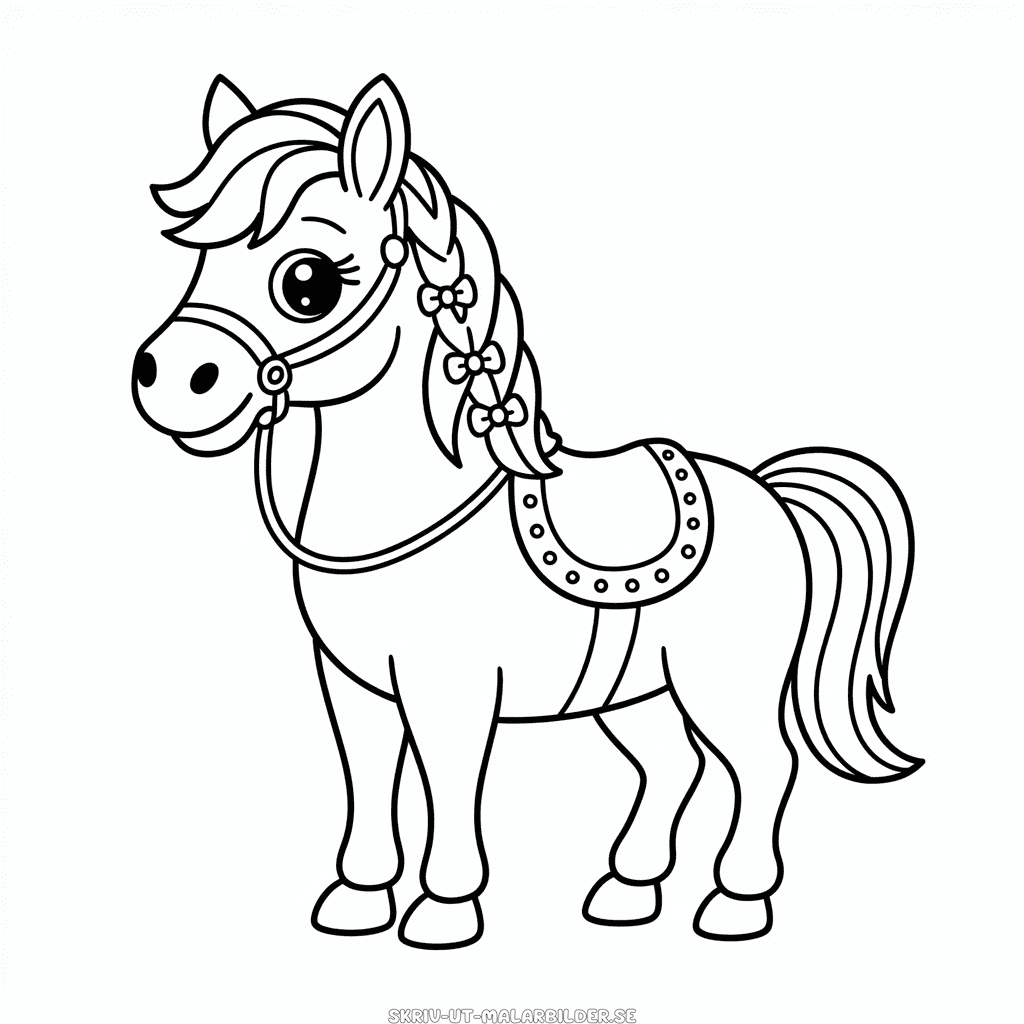 Gratis målarbild med Fancy Häst, en elegant hästfigur som barn älskar att färglägga. Skriv ut och färglägg denna teckning med den stiliga Fancy Häst för barn. Högkvalitativ PNG-bild i svartvitt, optimerad för utskrift som A4-PDF.
